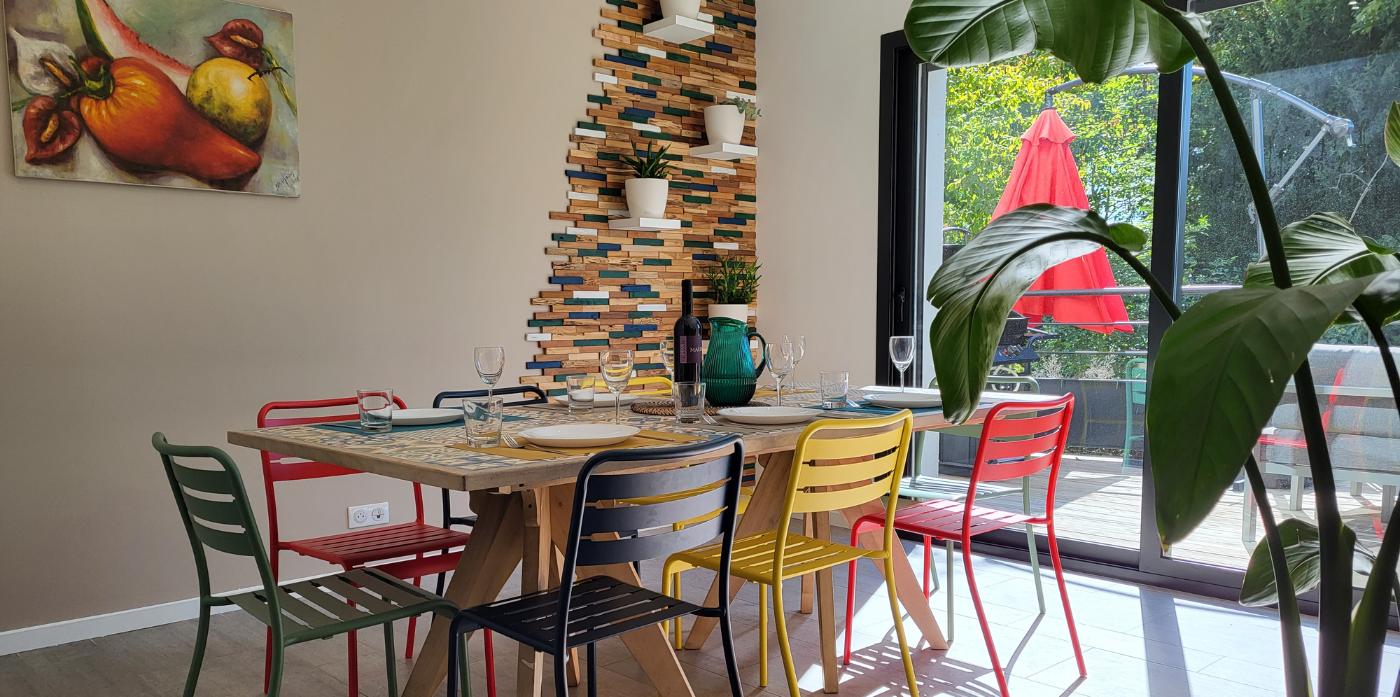 Vous aurez accès à notre CUISINE ENTIÈREMENT ÉQUIPÉE incluant robot de cuisine. Nos herbes aromatiques sont à votre disposition pour assaisonner vos plats et/ou vos viandes cuites aux BARBECUE sur la terrasse. Il est également possible de se faire livrer vos repas ou aller au restaurant à pied.
